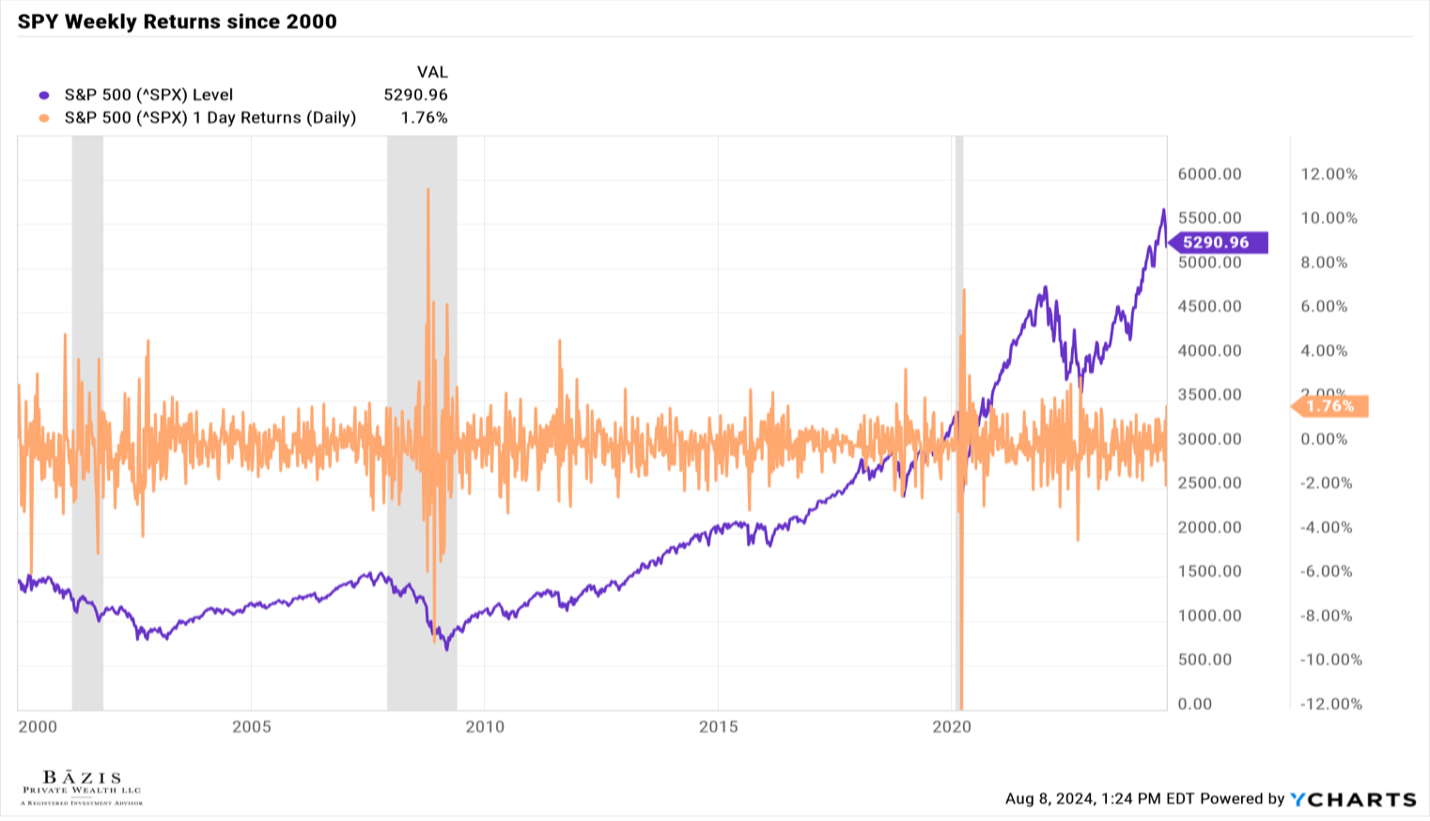 When persistent downward volatility exists, it can create opportunities to buy undervalued securities, rebalance portfolios, and utilize tax-loss harvesting. In our view, investors should maintain a long-term perspective during volatile periods. Despite recent fluctuations, the S&P 500 was still up ~9% year-to-date by end of the first week of August 2024, which doesn’t make as sensational of headlines compared to headlines highlighting the markets very recent downturns.